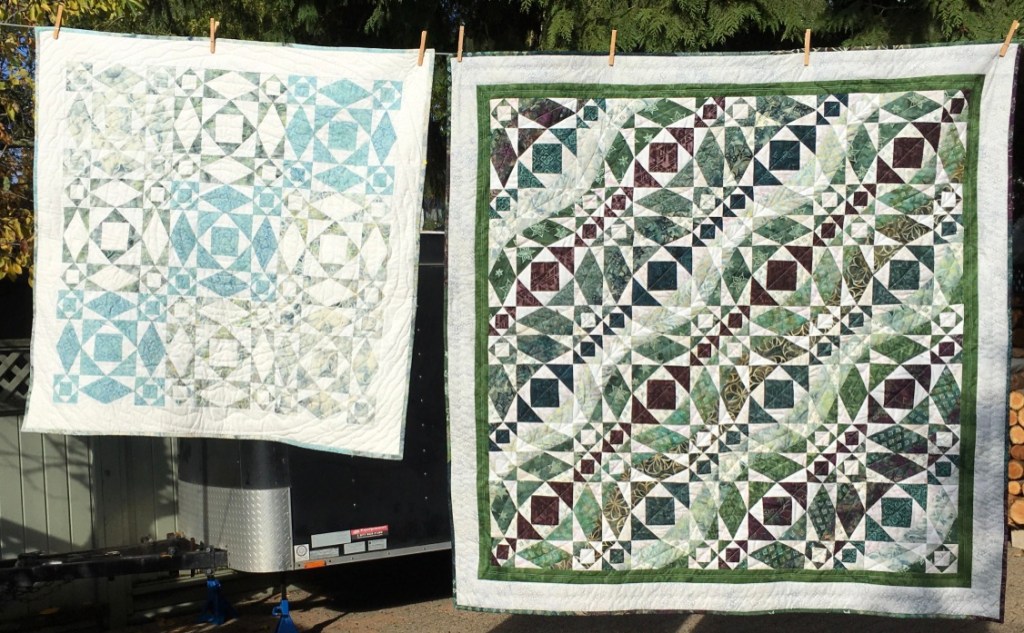These are the 2 quilts I made to test the mystery. The first one uses an older Island Batik that I bought, but neglected to keep record of the name of the fabric. It is paired with solid white. Although it was started in 2020, it was not finished until 2021.
