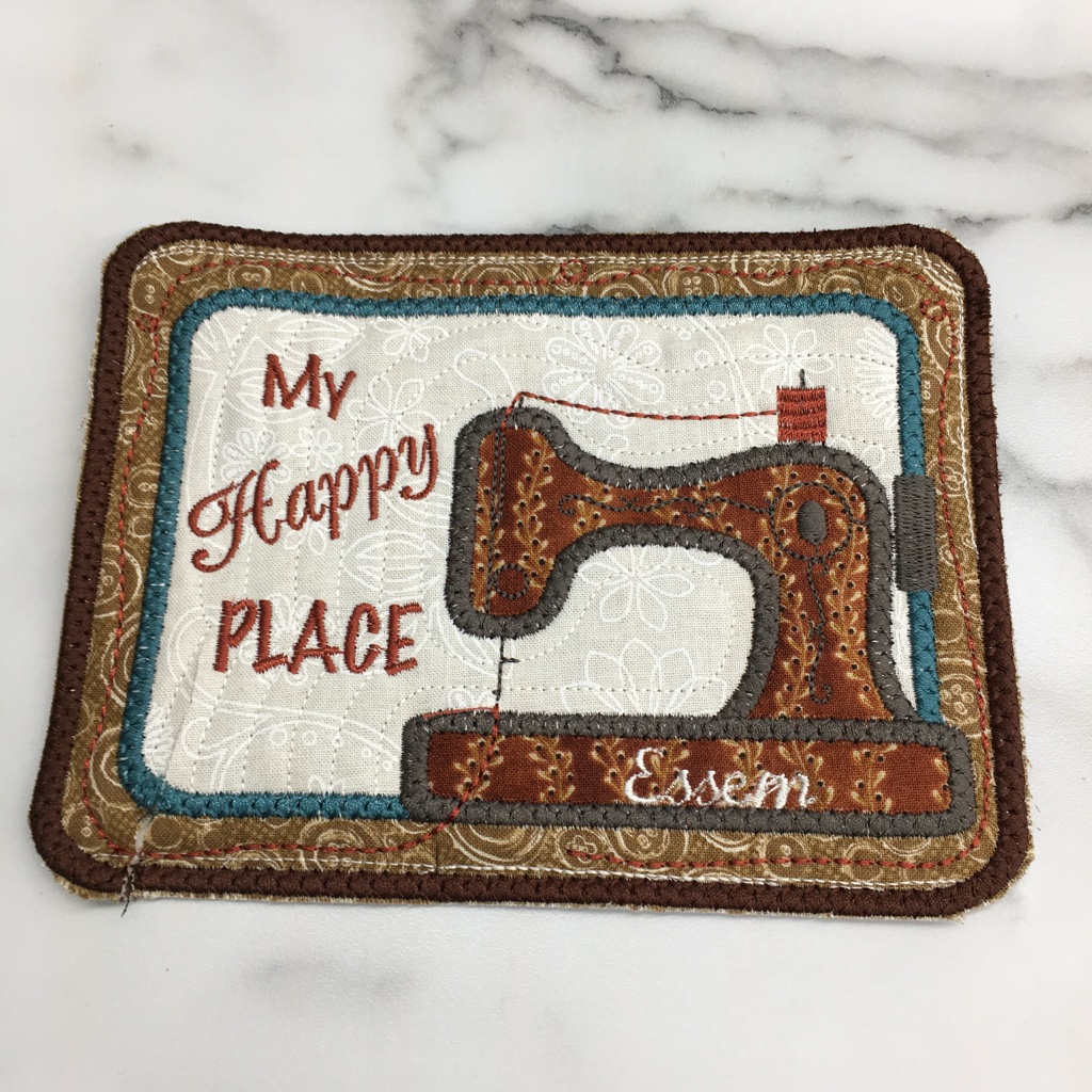 I usually take a water bottle with ice in it and it sweats and leaves RINGS where ever it is placed. I needed to make a mug rug and this fit the bill! It’s a free embroidery design from Kreative Kiwi. Kreative Kiwi has a LOT of free patterns and the directions are easy to follow. I added “Essem” to personalize it for the store.