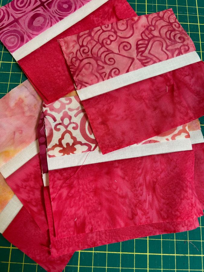 So Scrappy provides a different colour each month for the Rainbow Scrap Challenge. January’s colour was “Pink.” I pulled out all my Island Batik scraps and started to play. I started out with rectangles that were 2 1/4” x 4 1/2“. I know it’s a super weird size, but my binding is cut at 2 1/4” and I started out with cutting binding scraps. I added a 1″ of solid white between the 2 rectangles.