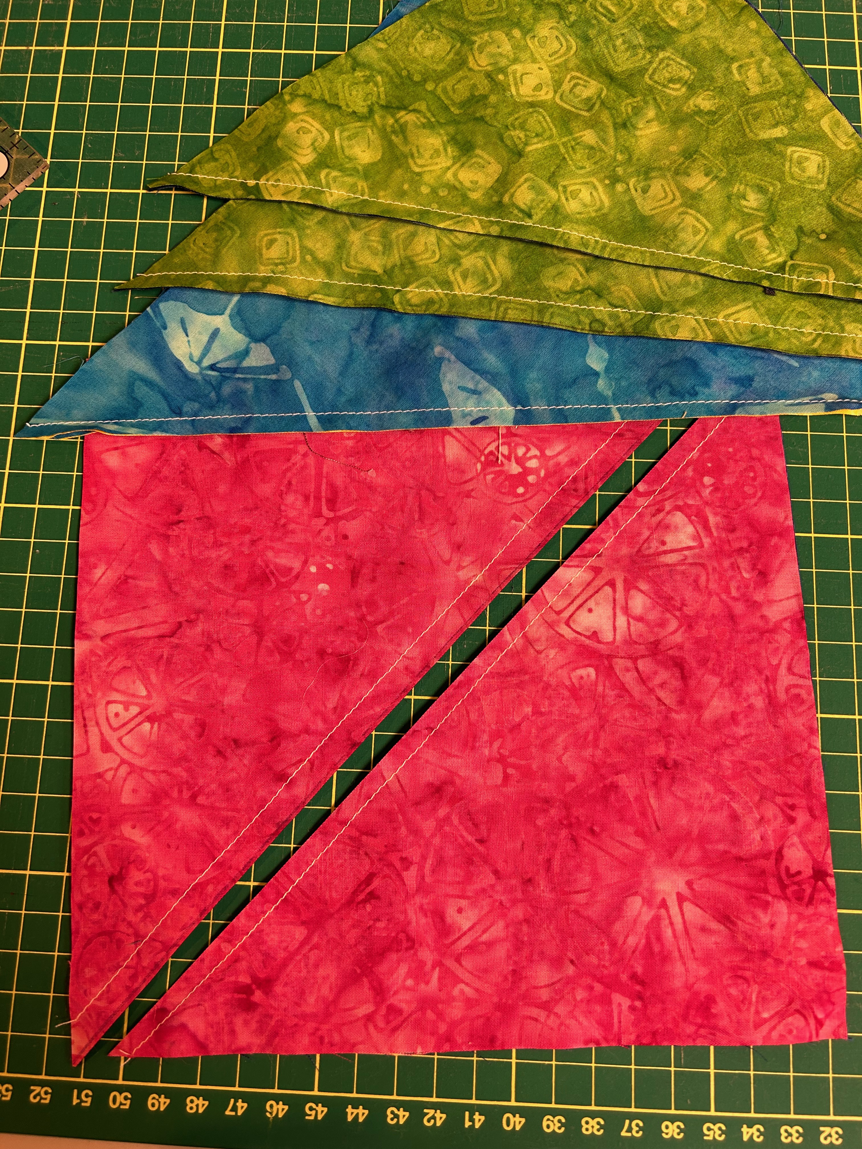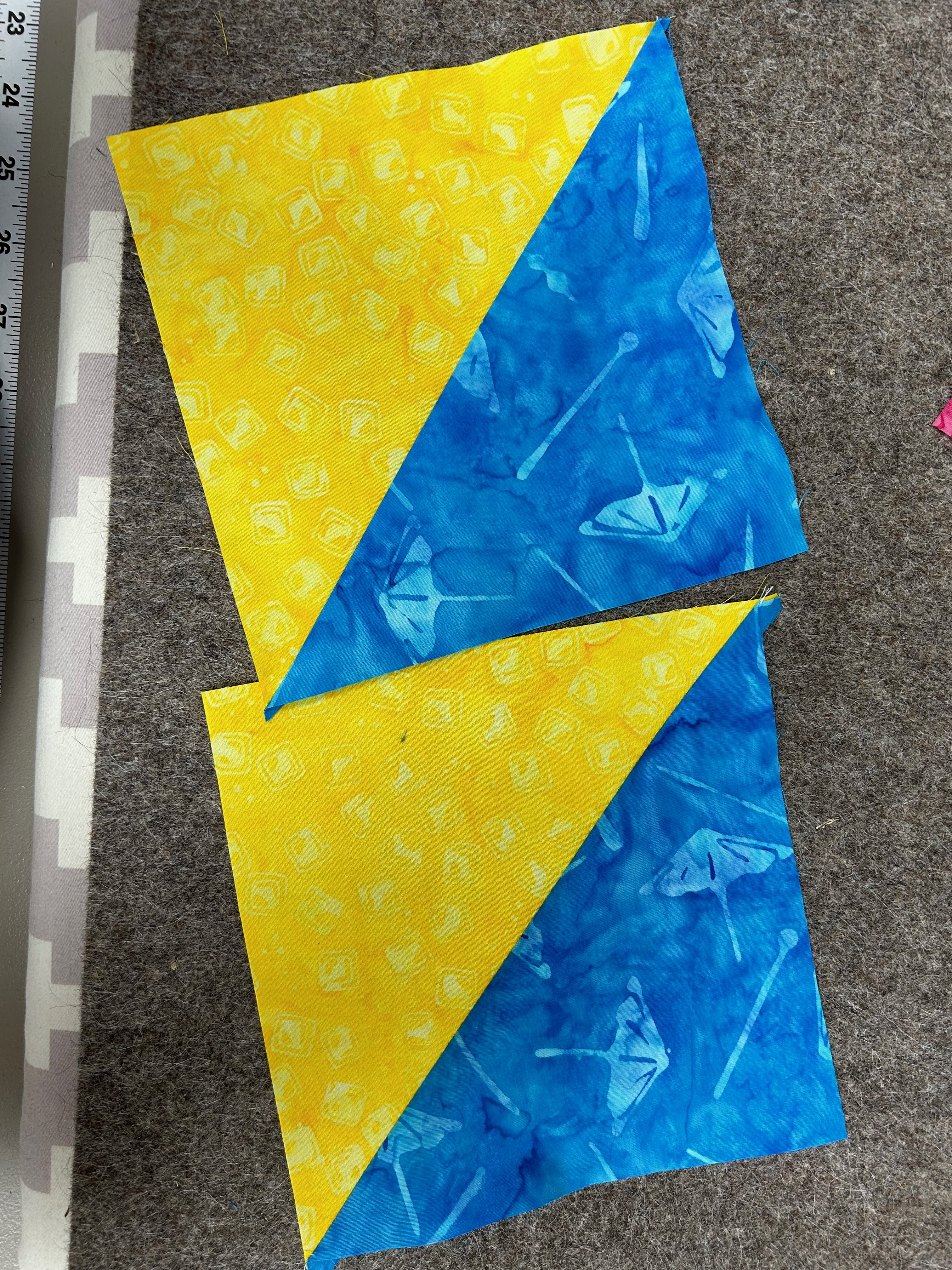 Take the (36) 7.5” x 7.5” squares from Clue #2, put the pairs right sides together. Mark the diagonal line. Sew a scant ¼” on each side of the diagonal line. Cut apart. Each pair will yield 2 Half Square Triangles. Press to the dark side. DO NOT SQUARE THEM UP!! I repeat DO NOT SQUARE THEM UP!!