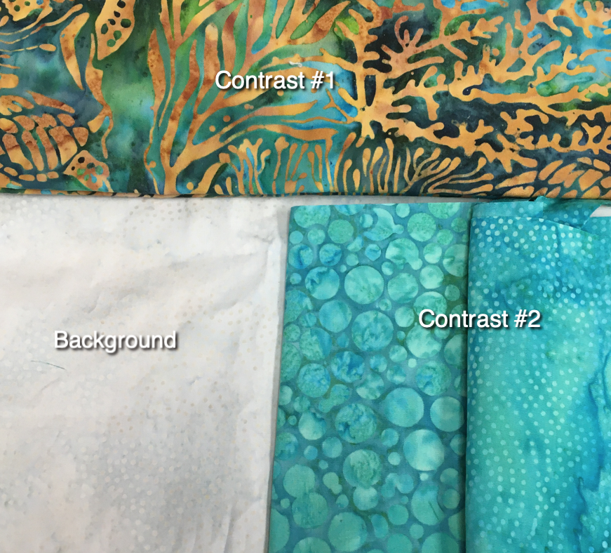 These are the fabrics I used. They are all Island Batik fabrics. The Background is Rice. Contrast #1 is an older fabric with turtles and sea grass … Contrast #2 is two similar coloured fabrics.