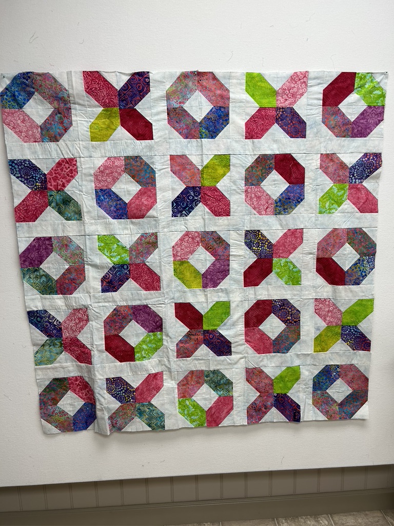 Here are my Blue Blocks … all quilted and finished. It’s been raining so much, that I haven’t taken a picture outside, so all you get is a picture of it on my design wall. It’s made totally of 2 1/2” squares of Island Batik blue scraps … including aqua, light & dark blue and any scrap IB fabric with blue in it. Along with Island Batik solid white. Quilted on my domestic sewing machine (Janome M7) using a rounded swirl motif (that’s my name for the motif).